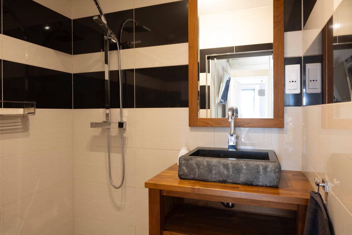 Une chambre d’amis avec salle de bain (douche à l’italienne) et WC